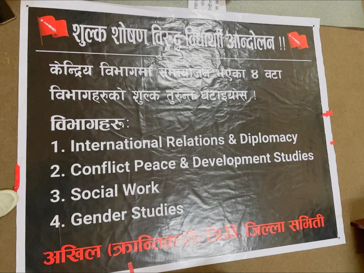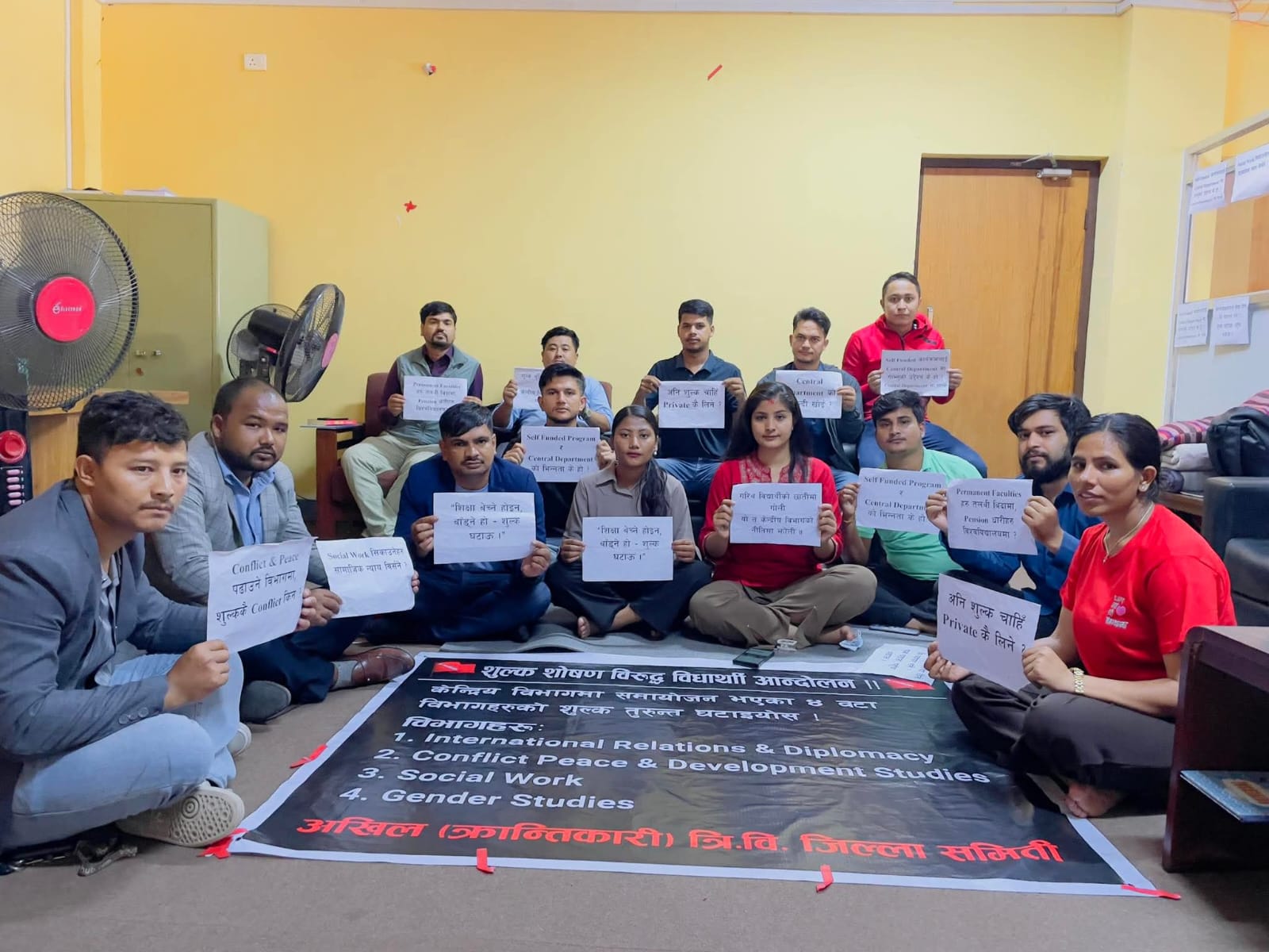 धर्नामा सहभागी विद्यार्थीहरुले “शिक्षा बेच्ने होइन, बाँड्ने हो” भन्ने नारासहित Self-Funded कार्यक्रम अन्तर्गत रहेका विभागहरू — International Relations & Diplomacy (IRD), Conflict Peace & Development Studies (CPDS), Social Work र Gender Studies — लाई केन्द्रीय विभागमा गाभिएपछि पनि पुरानै (Private) शुल्क असुल्दै आएकोप्रति आपत्ति जनाएका छन्।