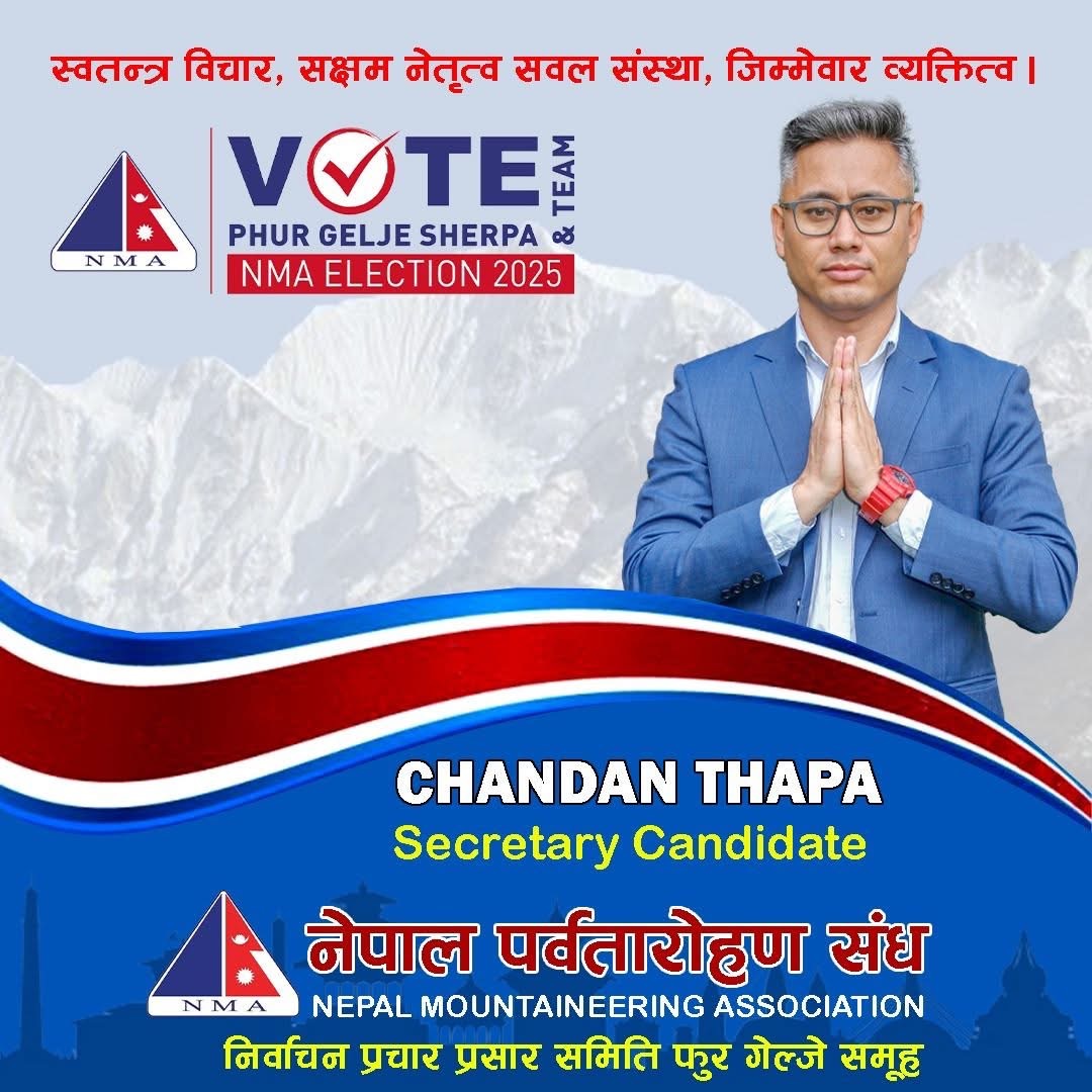 काठमाडौं, भदौं ३ — नेपाल पर्वतारोहण संघ (NMA) को २०८२ साल भदौं ७ गते (23rd August 2025) हुने निर्वाचन नजिकिँदै गर्दा, पर्यटन व्यवसायी तथा पर्वतीय क्षेत्रका सक्रिय अभियन्ता चन्दन थापाले सचिव पदमा आफ्नो उम्मेदवारी औपचारिक रूपमा घोषणा गरेका छन्। थापाको स्थायी घर भिमसेन थापा गाउँपालिका–६, गोर्खामा रहेको छ।