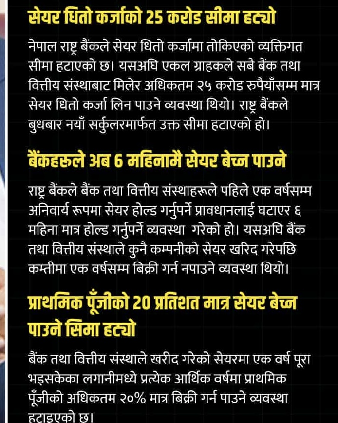 राष्ट्र बैंकले लगानीकर्ताले शेयर धितो राखेर लिन सक्ने कर्जामा तोकिएको २५ करोड रुपैयाँको सीमा हटाएको छ। यसअघि एउटै ग्राहकले विभिन्न बैंक तथा वित्तीय संस्थाबाट अधिकतम २५ करोड रुपैयाँसम्म मात्रै शेयर धितो कर्जा लिन सक्थे। नयाँ व्यवस्थाअनुसार अब बैंकहरूले आफ्ना आन्तरिक नीति र जोखिम मूल्याङ्कनका आधारमा आवश्यक परेअनुसार कर्जा प्रवाह गर्न सक्नेछन्। यस कदमले ठूला लगानीकर्ताको पहुँच बढाउने र बजारमा पूँजी प्रवाह सहज बनाउने अपेक्षा गरिएको छ।